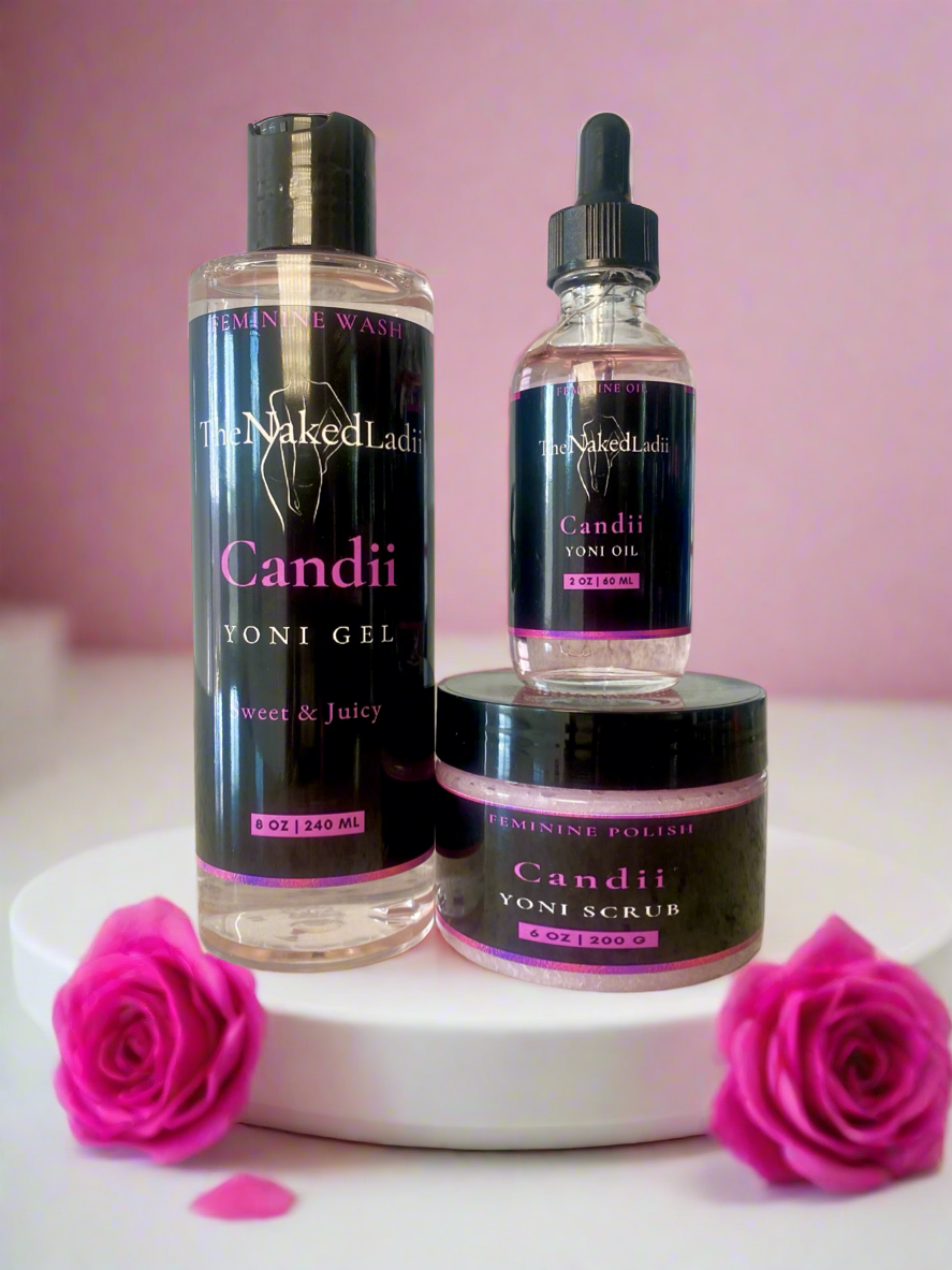 CANDII Yoni Kit: Satisfy your sweet side with our CANDII Yoni Kit! This all-natural, gynecologist-approved trio includes a gentle wash, exfoliating scrub, and nourishing oil, all infused with a delicious candy-like scent. Perfect for sensitive skin, it helps balance your pH, supports vaginal health, and naturally enhances your body’s wetness and taste. Treat your yoni to the ultimate sweet and fresh experience!